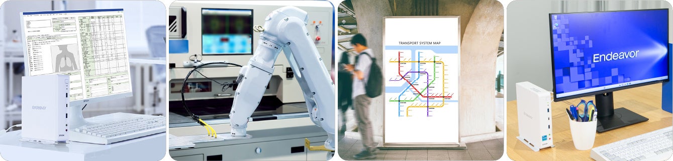「Endeavor ST210Eシリーズ」は、ビジネスで必要とされるコンパクトさとパフォーマンスを兼ね備えた製品です。設置場所を選ばないサイズ感で、一般オフィス用途はもちろん、医療や介護、製造業の現場からサイネージ表示まで、さまざまなお客様にご活用いただいています。