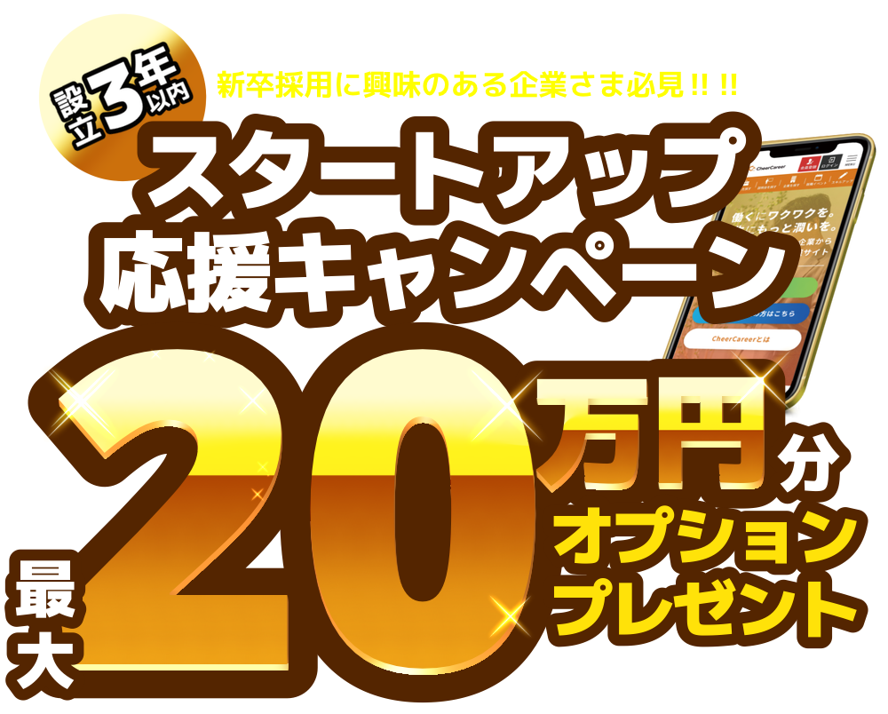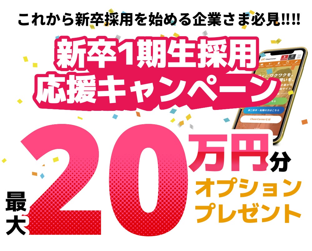 そんなCheerは キャリアの選択肢を広げるためにスポットライトが当たりにくい業界や地方企業、ベンチャー企業にスポットライトを当てる活動や、リアリティある仕事の現実などを伝えることを通し、啓蒙活動に取り組み、数多くの雇用創出を生み出しています。今回のキャンペーンでは、都市圏の企業様に比べてスポットライトが当たりにくい地方企業様、設立当初のスタートアップ企業様、初めての新卒採用に挑戦する企業様に向けて露出強化施策オプション最大20万円分を無料付与させていただく運びとなりました。今回のキャンペーンを通して、少しでも多くの学生に対して地方中小企業様、スタートアップ企業様、そして初めての新卒採用に挑戦する企業様への出会いを促進させていきます。