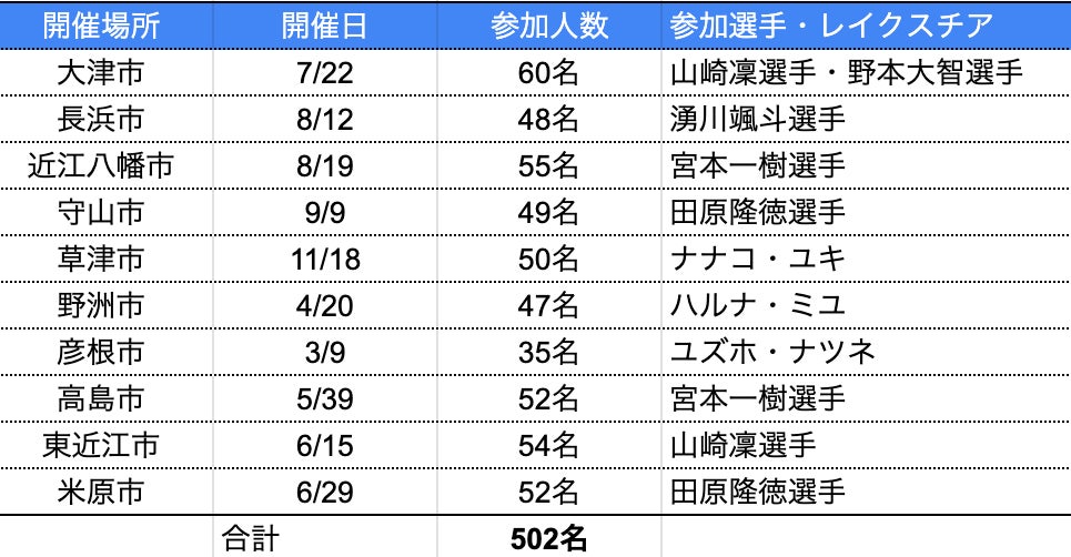 2023年7月22日に開催した大津市での第1回目から2024年6月29日に開催した米原市での第10回まで、全10回の活動にファン・ブースター・パートナー企業から合計502名の皆様に参加していただき、滋賀レイクスの選手・レイクスチアリーダーズと湖岸を清掃しました。