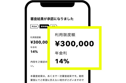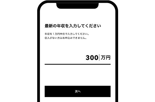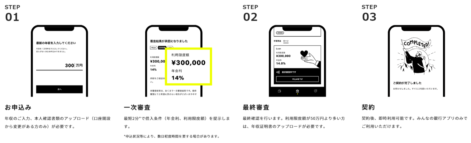 本サービスは、みんなの銀行の口座をお持ちの方であれば、年収のみの入力でお申込いただけます。審査後、お客さま毎に年金利(1.5%~14.5%)およびご利用限度額(10万円~1,000万円)をご回答いたします。