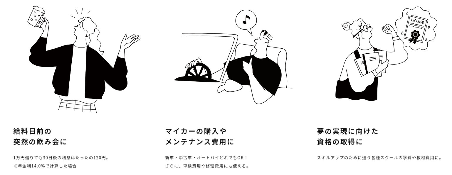 | 返済方法 | •毎月末日までに約定返済額(前月1日から前月末日までの利息金額)をアプリ操作にて返済、操作無の場合、毎月末日に自動引落し |