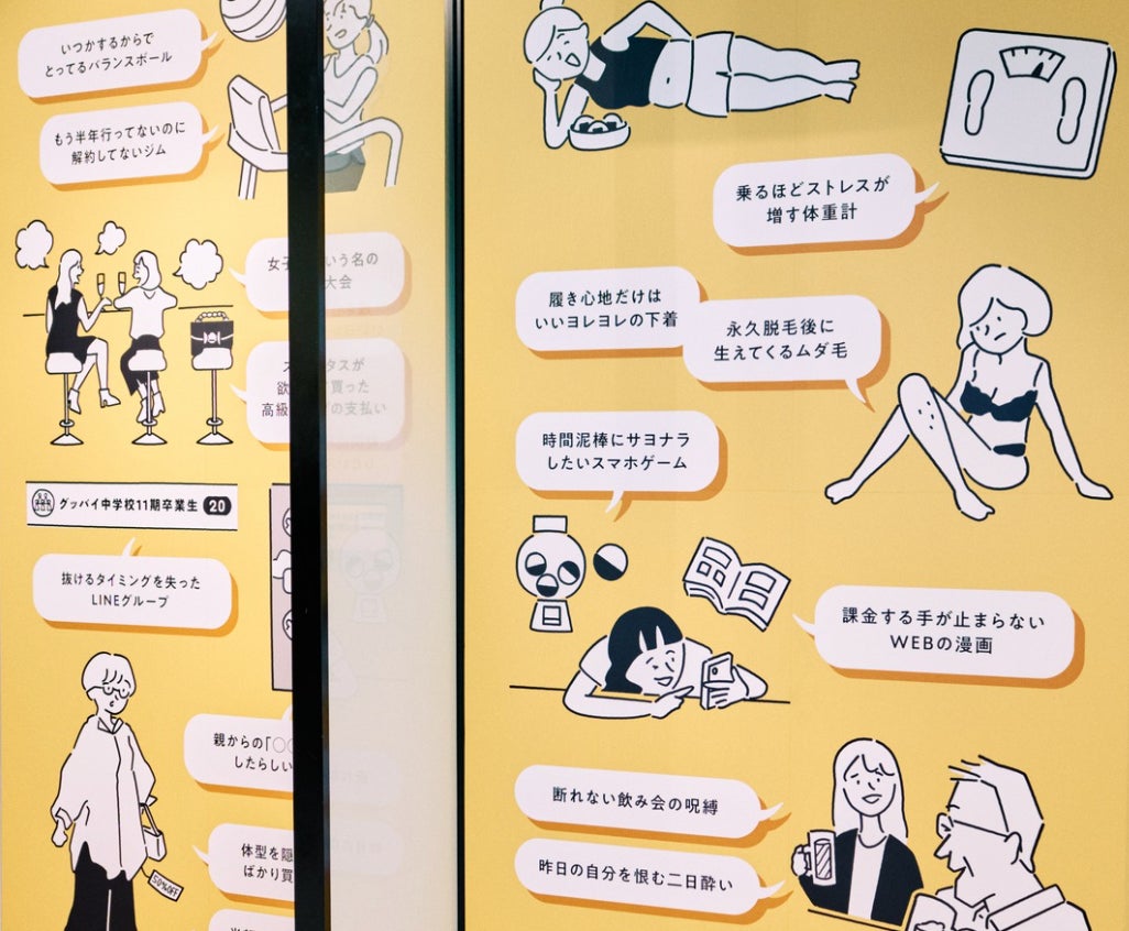 事前募集から厳選されたエピソードをオリジナルイラストとして展示。断れない飲み会の呪縛、乗るほどストレスが増す体重計、トリートメントにかける時間など、現代女性ならではの"捨てたい〇〇"が会場いっぱいに展示されました。