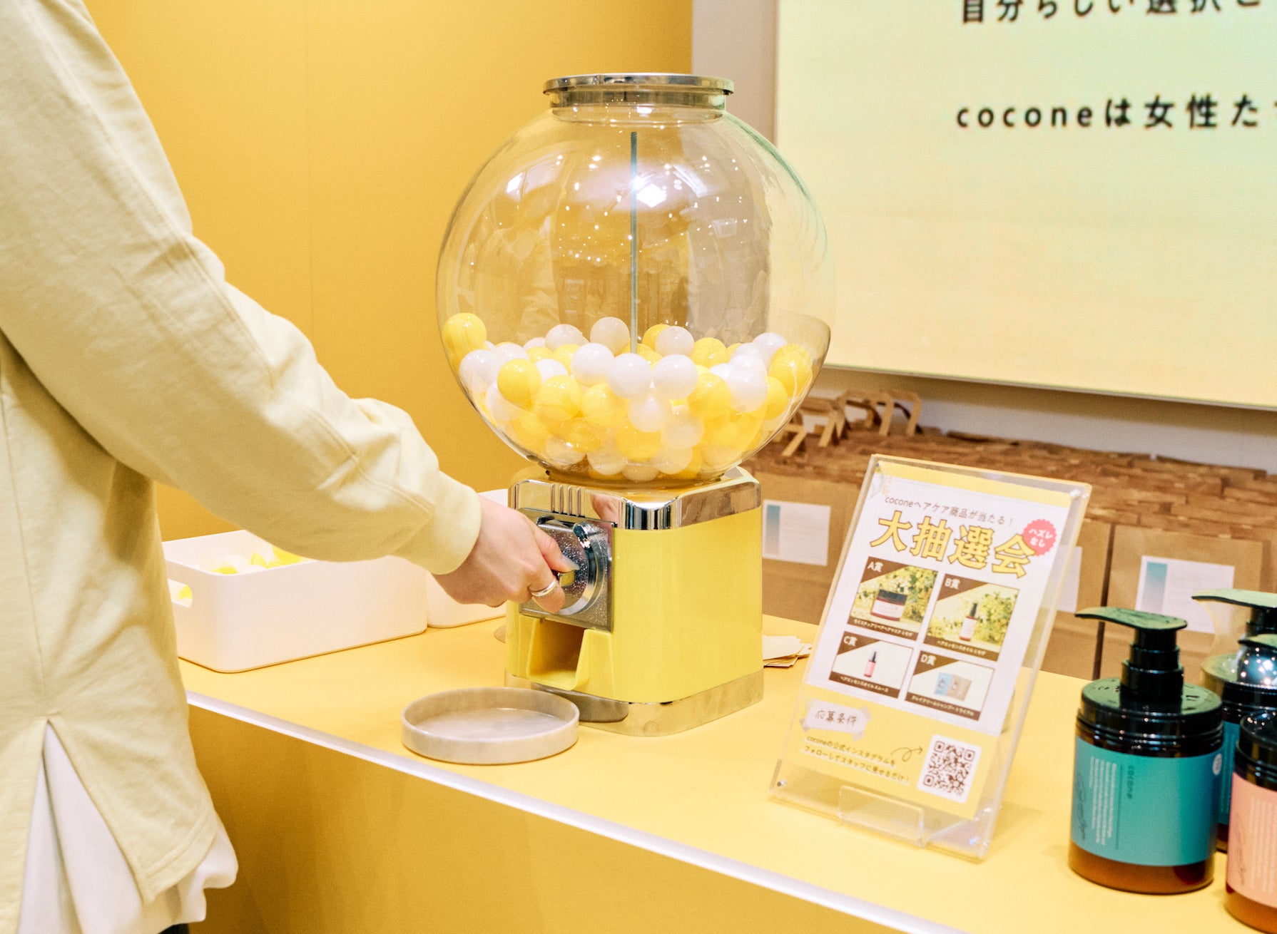 公式SNSをフォローで参加できるガチャガチャスペースでは、coconeヘアケアがハズレなしで当たる大抽選会を開催。一時は会場外まで行列ができるほど反響をいただきました。