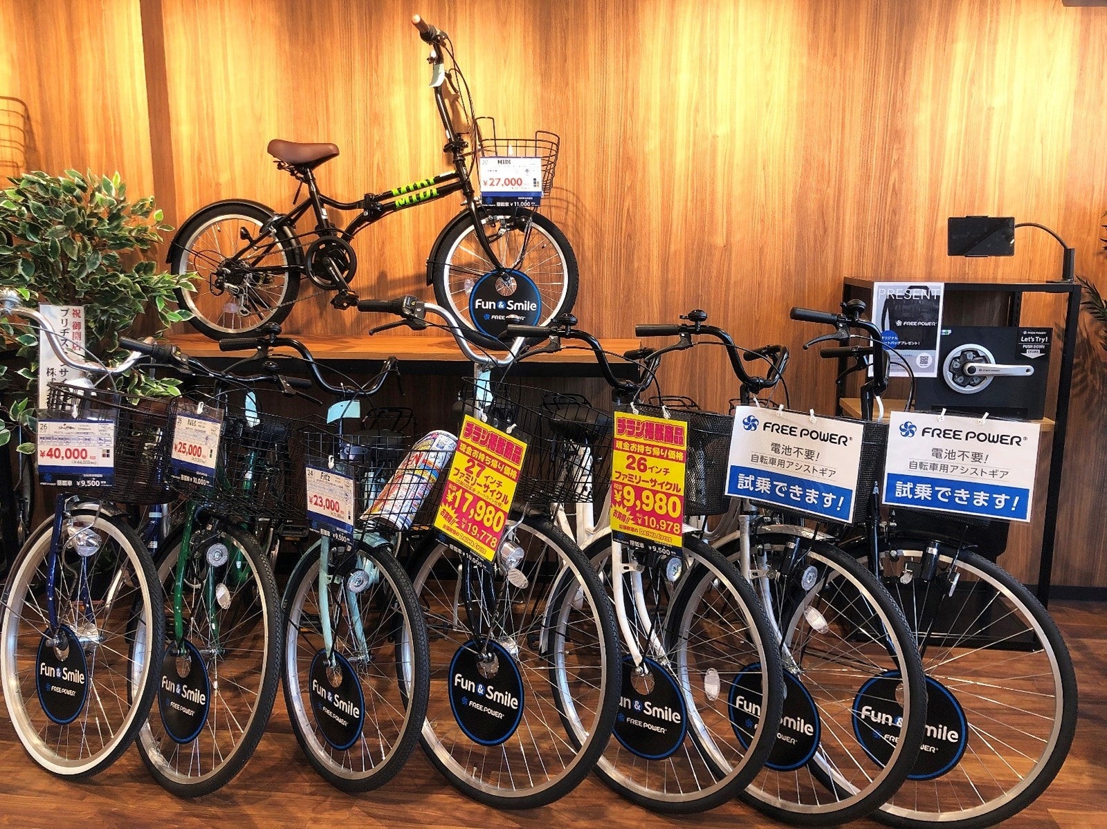 また、電気のいらないアシストギアの「フリーパワー」は通常お取り寄せの商品ですが、常設車をご用意しておりますので、当日中にお持ち帰りいただくことができます。