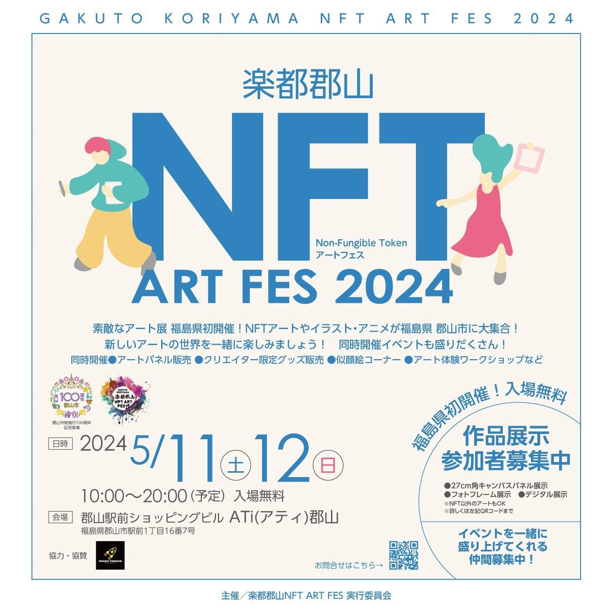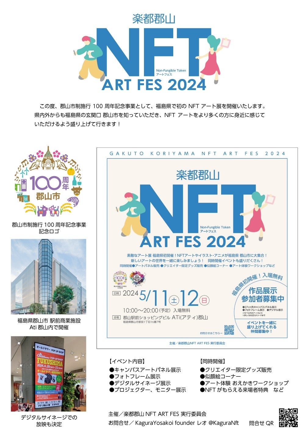 楽都郡山NFT ART FES♬は、福島県郡山市にあるショッピングビル「Ati郡山」にて開催されるNFTアート展示会です。限定グッズ販売や似顔絵コーナー、アート体験ワークショップなど、さまざまなイベントも同時開催され、来場者限定配布のNFT特典もございます。