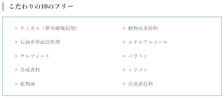 全成分:(カプリル酸/カプリン酸)ヤシアルキル、酸化亜鉛、乳酸桿菌/加水分解コラーゲン発酵液エキス、ラウリン酸メチルヘプチル、パルミチン酸デキストリン、酸化チタン、BG、エリスリトール、ポリリシノレイン酸ポリグリセリル-6、ペンチレングリコール、(アブラナ種子油/シナアブラギリ種子油)コポリマー、酸化鉄、チャ種子油、ナイアシンアミド、加水分解ヒアルロン酸、アスコルビルグルコシド、チャ葉エキス、プルーン分解物、ワイルドタイムエキス、ノウゼンハレン花/葉/茎エキス、クダモノトケイソウ果実エキス、グリチルリチン酸2K、イヨカン果皮油、 ニオイテンジクアオイ油 、ビターオレンジ葉/枝油、 ベルガモット果実油、ユズ果皮油、ラベンダー油、レモン果皮油、ローズマリー葉油、グリセリン、トコフェロール 、クエン酸Na、水、ステアリン酸、リシン、
