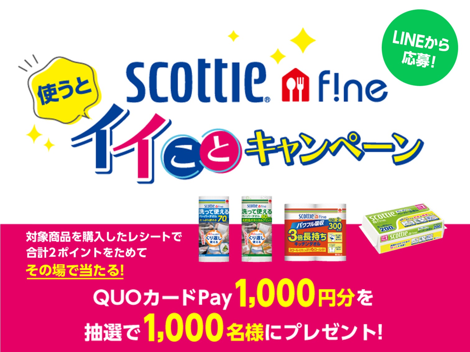 日本製紙グループの日本製紙クレシア株式会社〔住所:東京都千代田区神田駿河台4-6、代表取締役社長:安永敦美〕は、スコッティのキッチン商品ブランドであるスコッティ ファインにおいて2024年11月1日(金)から2025年1月31日(金)の期間、「スコッティ ファイン 使うとイイことキャンペーン」を実施いたします。対象商品を購入したレシートで2ポイントをためて応募、抽選で1,000名様に「QUOカードPay1,000円分」がその場で当たります。