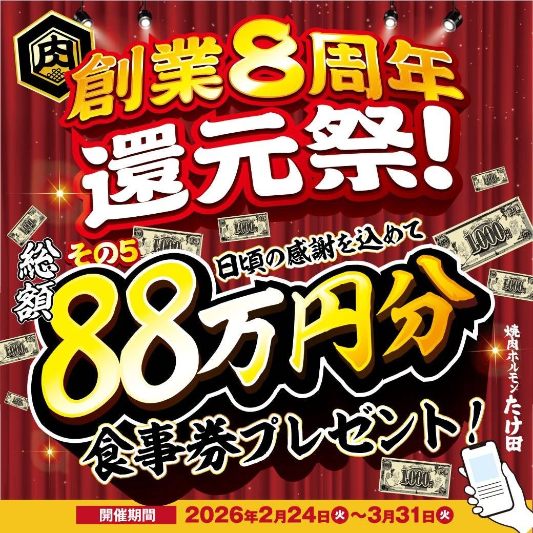 株式会社ミナモト(本社:埼玉県入間市、代表取締役:細田 源太)が運営する「焼肉ホルモンたけ田」は、日頃のご愛顧への感謝を込めて、創業8周年記念『還元祭』を2026年2月24日(火)〜3月31日(火)の期間限定で開催いたします。