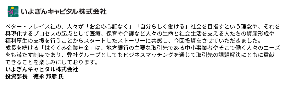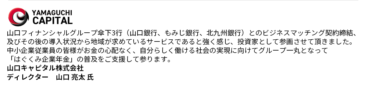 このたび、「やさしい人がやさしいままでいられる世界へ」という当社ビジョンを実現するための金融サービスである「はぐくみ企業年金」の普及にお力添えを戴くべく、6社(者)のお仲間にご出資を戴きました。いよぎんキャピタル株式会社様(いよぎんホールディングス)、株式会社佐銀キャピタル&コンサルティング様(佐賀銀行)、山口キャピタル株式会社様(山口フィナンシャルグループ)、株式会社ウイング・キャピタル・パートナーズ様(足利銀行)は、それぞれの地域を代表する金融機関であり、これにより地方の中小企業や福祉業界で働く方々へ、しっかりとサービスをお届けすることが可能になりました。