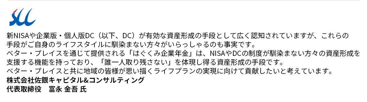 また、今後も地方銀行との提携をさらに強化し「はぐくみ企業年金」の普及を全国に拡大することで、世代・業種・性別および企業規模や居住地域に関わらず、「誰もが簡単に資産形成ができる環境」を構築し、富裕層でない一般の人々の資産形成を後押ししてまいります。