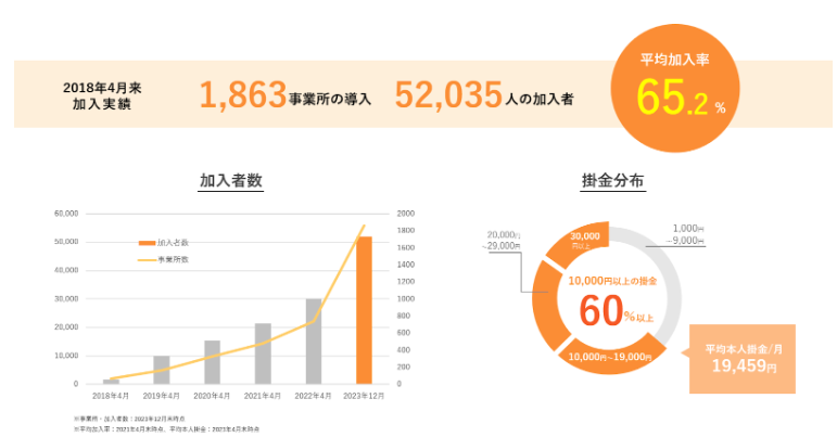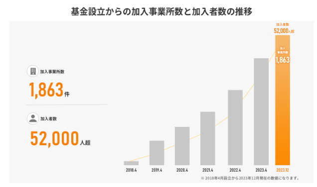 地方銀行の皆さまのご支援もあり、福祉業界だけではなく全国の中小企業に「はぐくみ企業年金」を導入いただいた結果、加入者数は急増しており、基金設立後わずか5年半で、加入事業所数1,863、加入者数52,035人(2023年12月末現在)と急拡大しています。