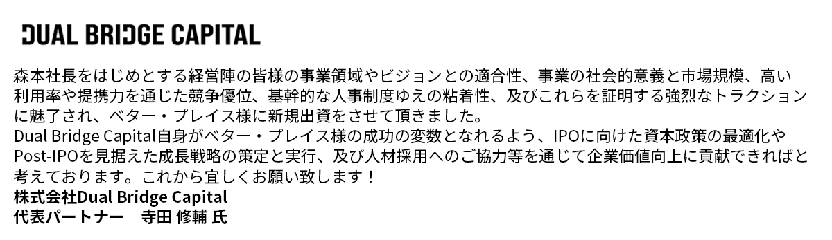 また、株式会社Dual Bridge Capital様は、「世代や産業を代表する傑出した経営者の輩出」をミッション(使命)にかかげて創設されたベンチャーキャピタルであり、その高い志と卓越した知見をお借りしながら当社のバリューアップを果たして参ります。