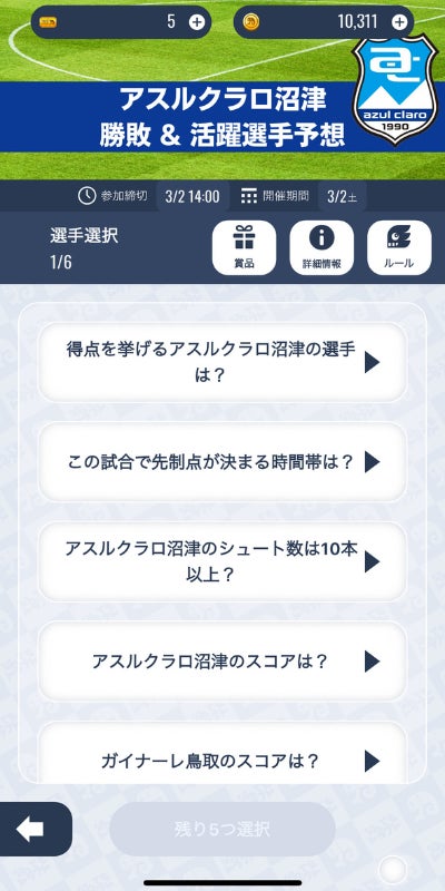 前節、ツエーゲン金沢との開幕戦を3−0で完勝したアスルクラロ沼津。今節は昨シーズンのJ3で6位、対戦成績1敗1分のガイナーレ鳥取を迎えての2週連続のホームゲーム。開幕2連勝を狙うこの試合の展開や活躍選手をぜひ予想してください。予想成績で1位となった方に、アスルクラロ沼津全選手サイン入りポスターをプレゼントします。