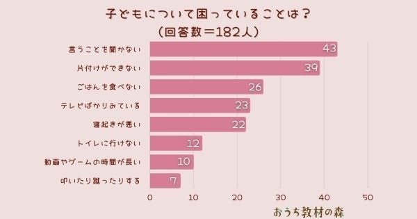 ARINA株式会社が運営する幼児、小学生の親御さん向けの教育メディア「おうち教材の森」(https://naki-blog.com/study/)は、日本全国の中学生以下のお子さんをお持ちの親御さんを対象に「子どもについて困っていることは?」とアンケート調査を実施しました。その結果を公表します。
