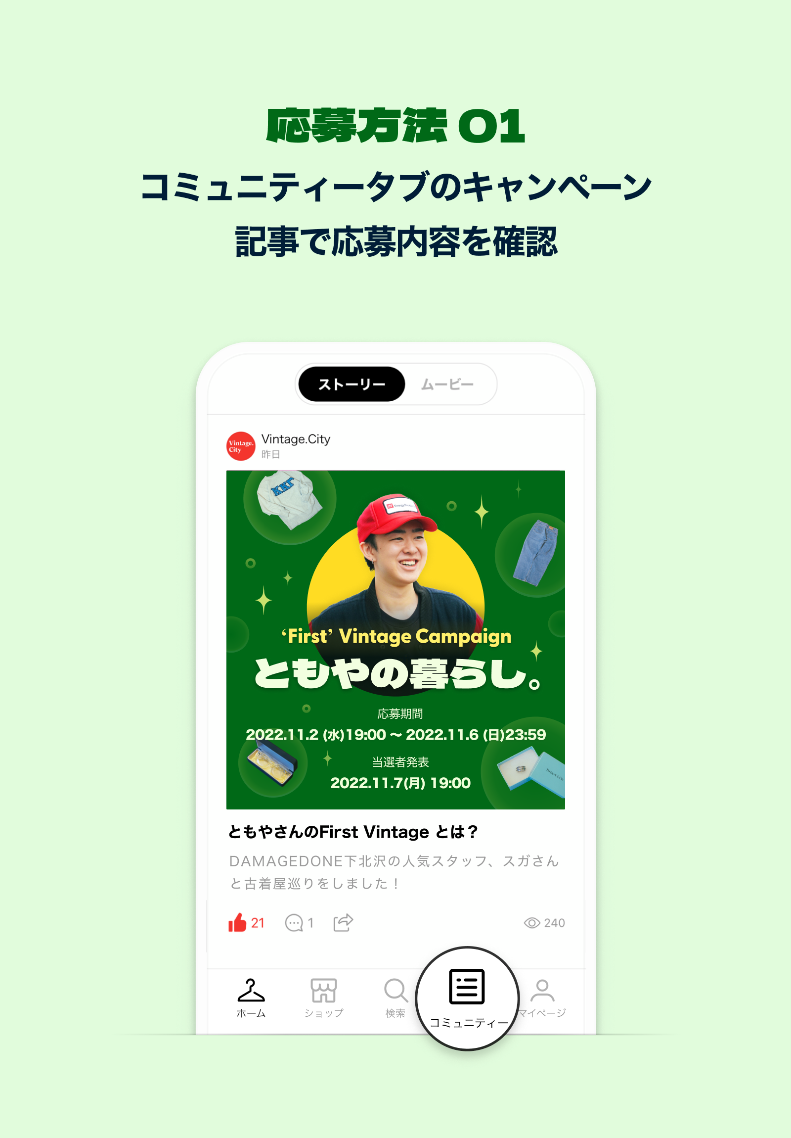 STEP1.ヴィンテージ・ファッション・アプリ「Vintage.City(ヴィンテージ・シティ)」内の「コミュニティ」ページに公開される「キャンペーン記事」で応募内容を確認。