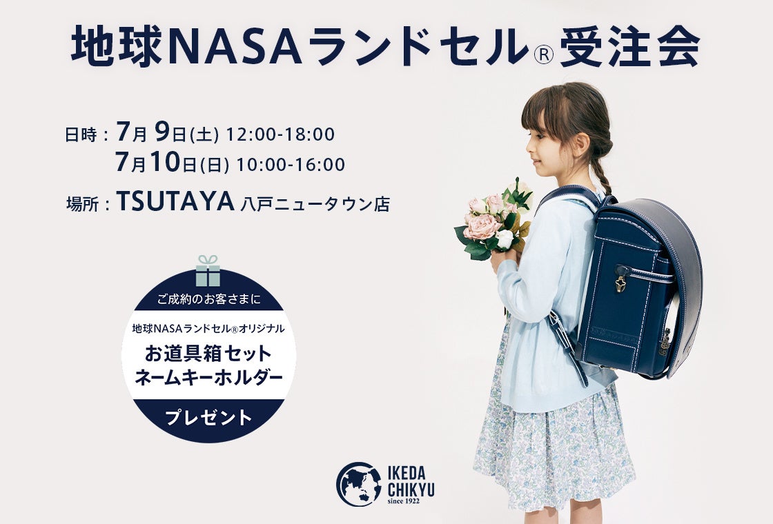 ランドセルの企画・販売を行う池田地球株式会社(本店:東京都港区:代表取締役 村尾光一)は、 7/9(土)~7/10(日)の2日間限定で青森県八戸市の「TSUTAYA八戸ニュータウン店」にて「地球NASAランドセル®受注会」を開催いたします。