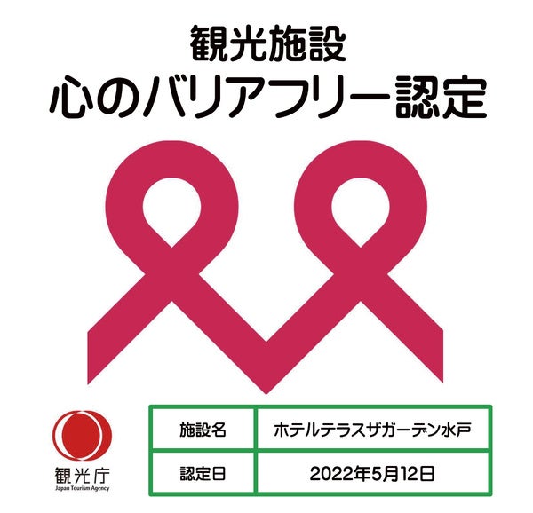 ホテルテラスザガーデン水戸はバリアフリー対応や情報発信に積極的に取り組む姿勢のある観光施設を対象とした「観光施設における心のバリアフリー認定制度」の認定を得た宿泊施設です。ご高齢の方や障害のある方がより安全で快適な旅行をするための環境整備に努めております