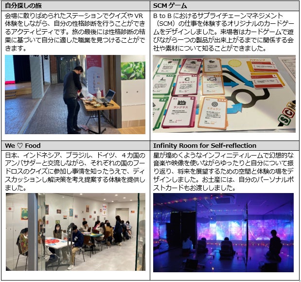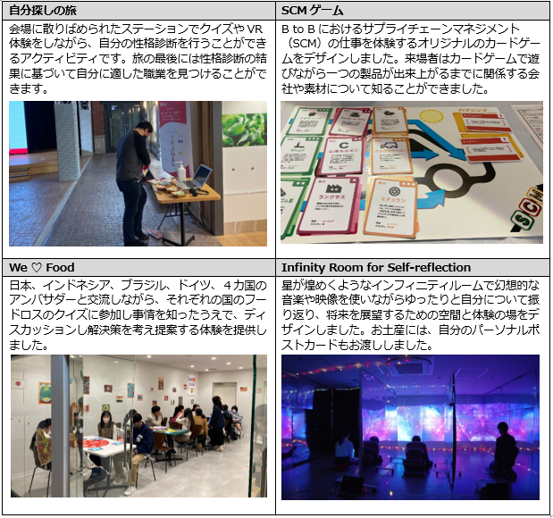 ・楽しみながら世界の現状など知れてとても良かった。また、自分探しなどこれからの未来についてのテーマが多くて良かった。それぞれの大学生の方の工夫や苦労がとても伝わってきて充実していた。