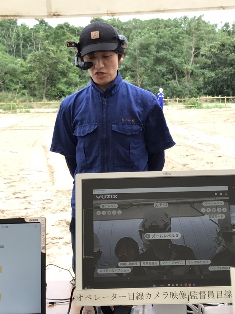 事務所(遠隔)に居ながらスマートグラスやウェアラブルカメラを活用することにより、現場状況をリアルタイムに把握することができる遠隔臨場の取組みを紹介。また、通信ネットワークを活用したバイタルデータのチェックなど作業従事者の健康管理を始めとした労働環境改善の取組みも併せて披露しました。