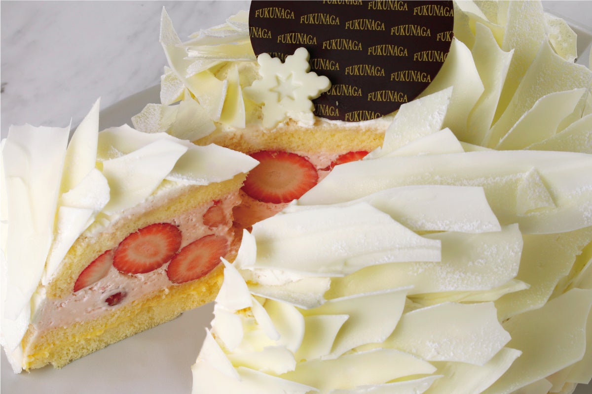 ベルギー産のホワイトチョコレートの羽をまとわせて華やかなクリスマスを演出。大人数で楽しめるプレミアムケーキです。