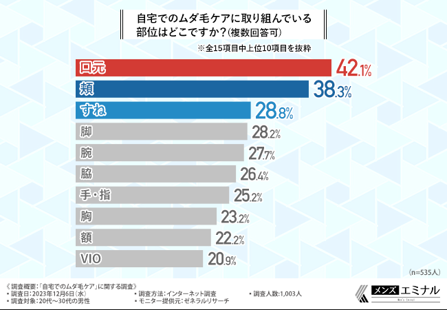 今回の調査で、20代~30代男性の約5割が自宅でムダ毛ケアに取り組んでいることが明らかになりました。