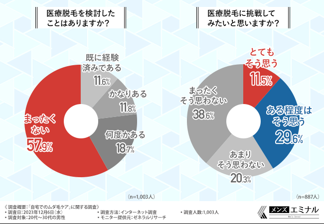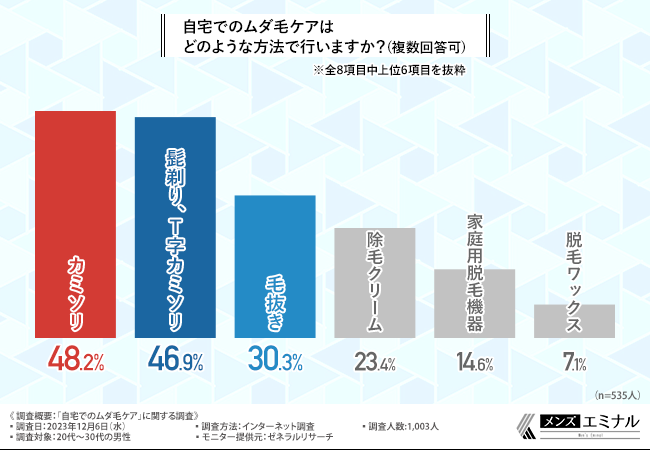 そこで今回、メンズ専用脱毛クリニック「メンズエミナル」(https://mens-eminal.jp/lp/?refmedia=31073)は、20代〜30代の男性を対象に「自宅でのムダ毛ケア」に関する調査を実施しました。