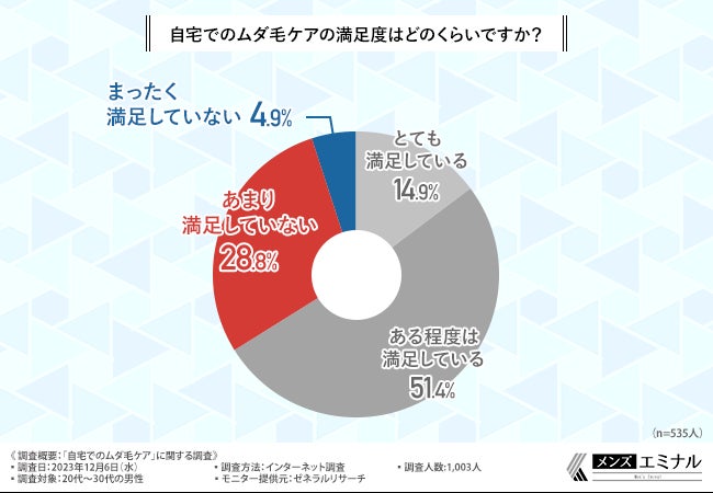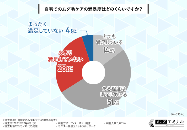 続いて、「自宅でのムダ毛ケアの満足度はどのくらいですか?」と質問したところ、『あまり満足していない(28.8%)』『まったく満足していない(4.9%)』という回答結果になりました。