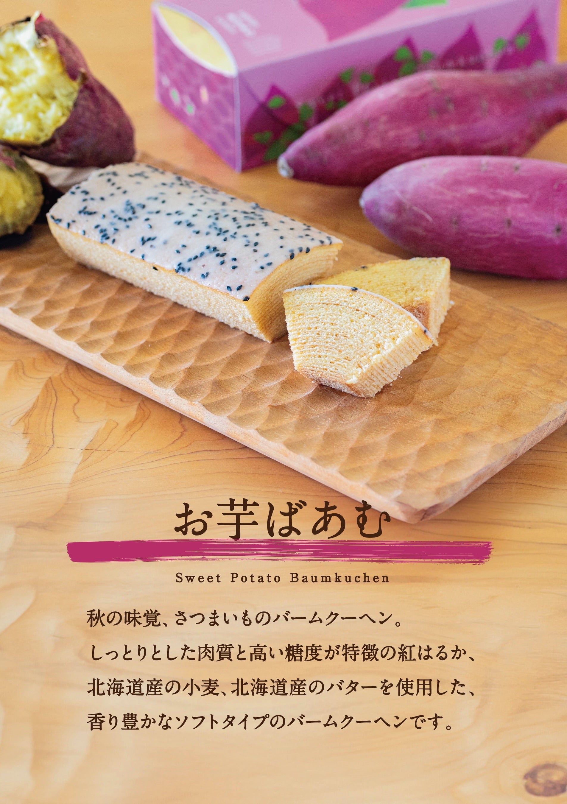しっとりとした肉質と高い糖度が特徴の紅はるか、北海道産の小麦、北海道産のバターを使用した、香り豊かなソフトタイプのバームクーヘンです。さつまいもの味を生かしたしっとり食感が特長です。