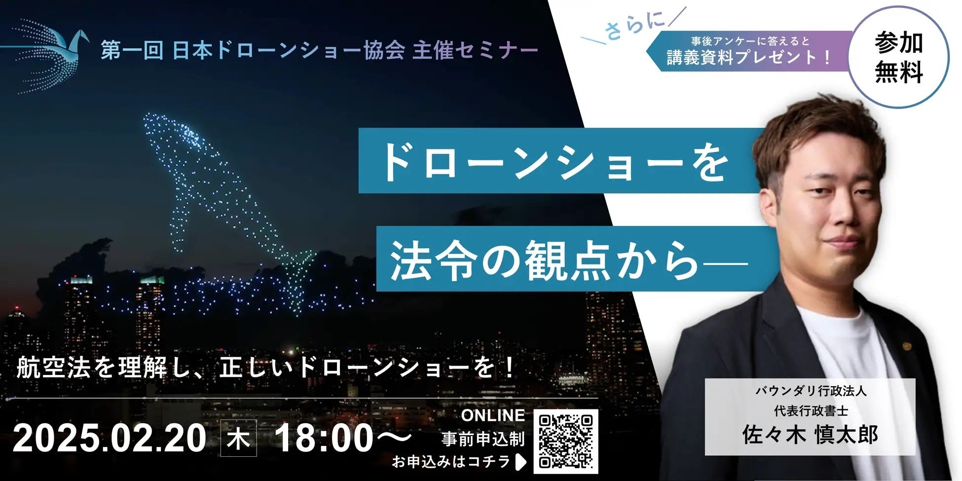 【2月20日開催】日本ドローンショー協会主催「ドローンショーに関連する法令動向」ウェビナーに、バウンダリ行政書士法人の代表・佐々木慎太郎が登壇