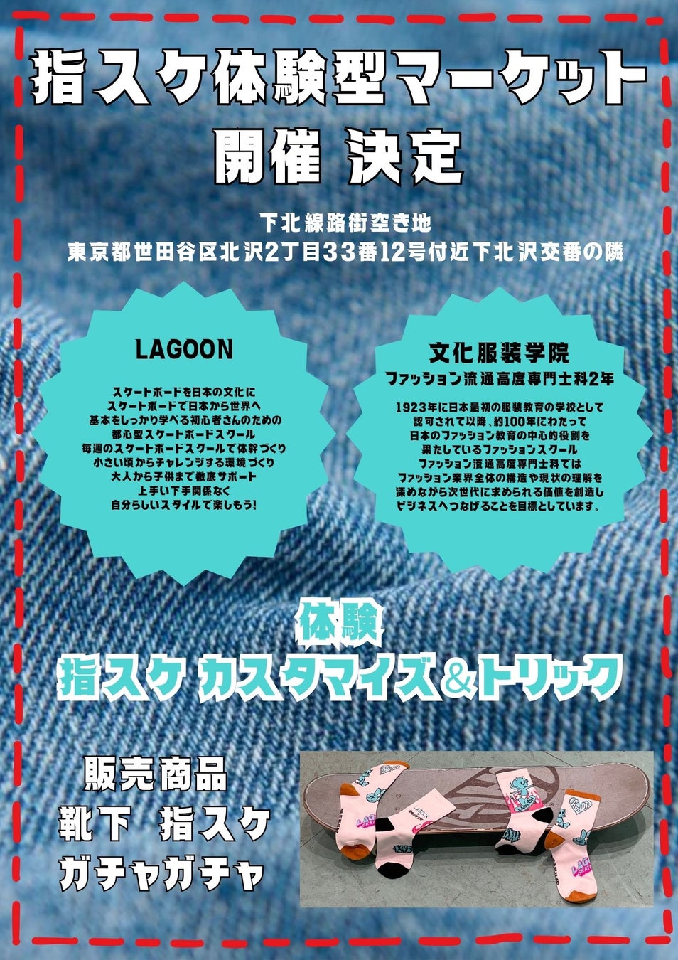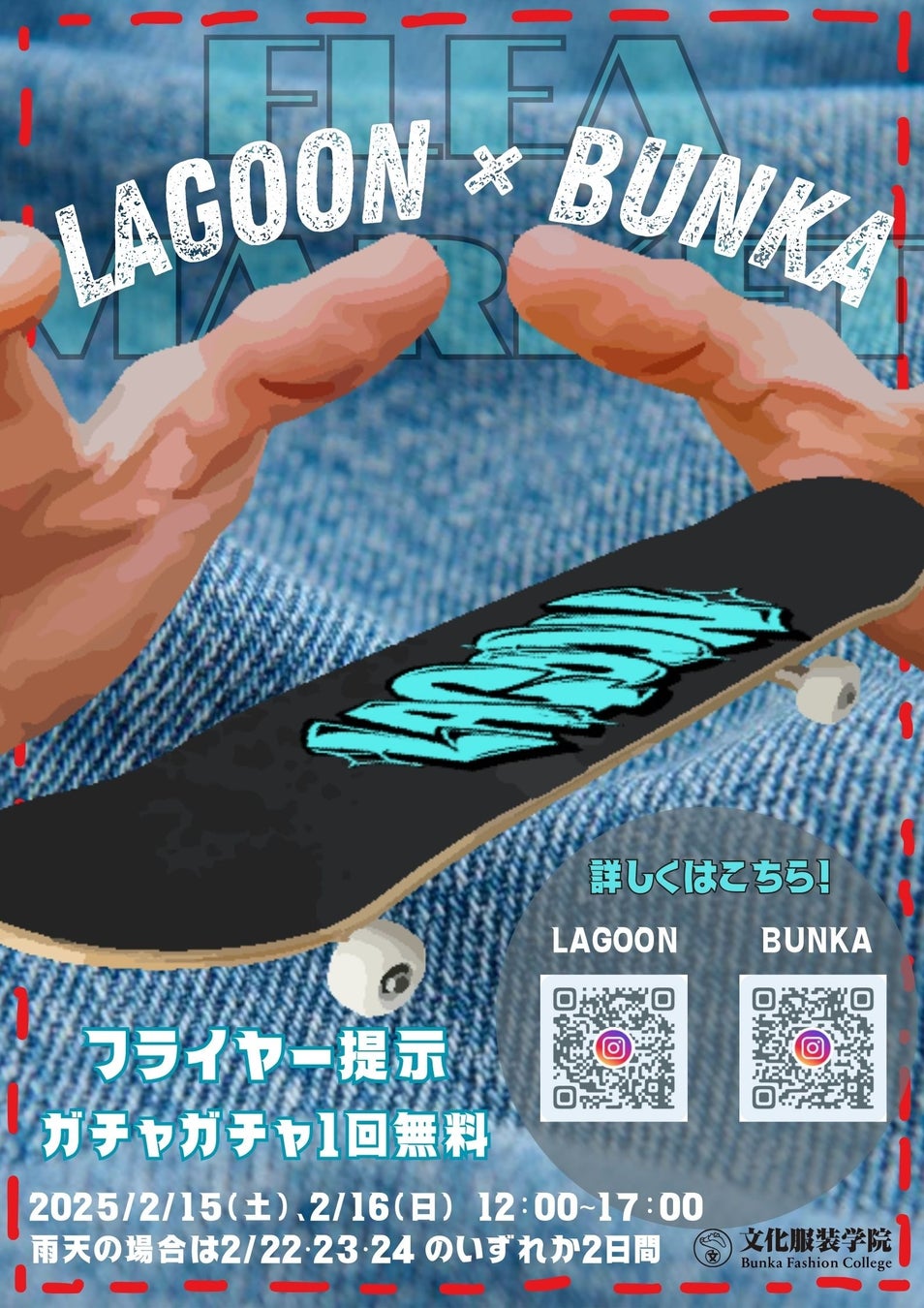 文化服装学院(学校法人文化学園 所在地:東京都渋谷区、理事長:清木孝悦 学院長:相原幸子)ファッション流通高度専門士科2年の学生は、原宿のスケートボードスクール(株)LAGOONとコラボレーションし、若者・親子向けの新感覚発信イベントを2月15日(土)、16日(日)12時〜17時下北沢フリーマーケット(下北沢線路街 空き地)で開催します。