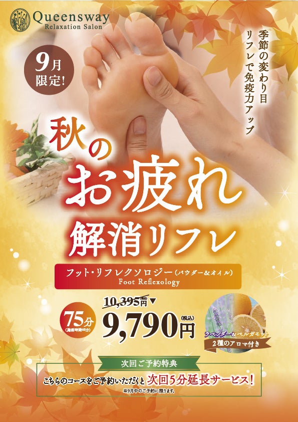 このたび、Queenswayが「秋のお疲れ解消リフレ」と題しまして2024年9月限定のお得なコースをご提供いたします。