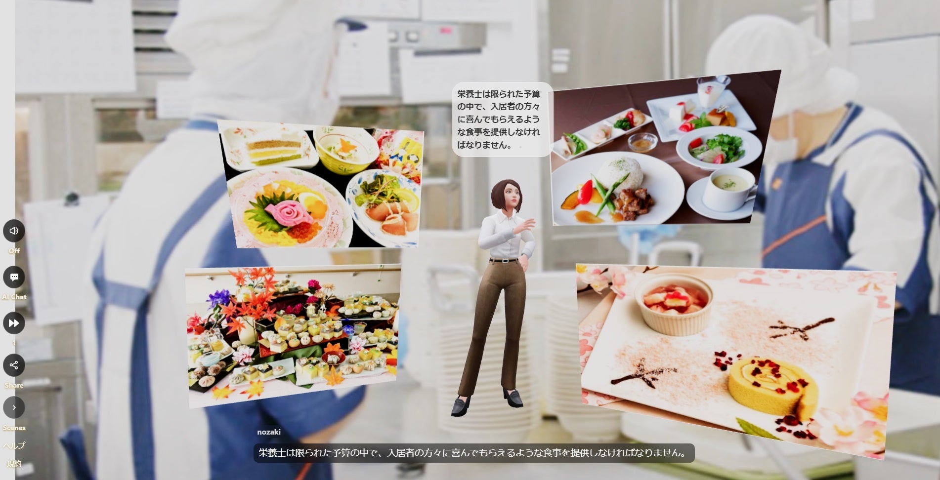 毎年1000名以上の栄養士・管理栄養士の採用の業務を効率化するためにAIアバター社員が写真やドキュメントを用いて採用業務をサポート致します。エントリー前のお仕事理解の深化として栄養士・管理栄養士が働く現場の魅力を、分かりやすく丁寧にお伝えいたします。