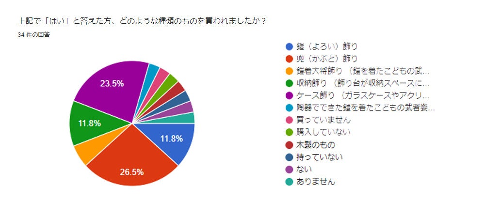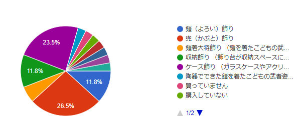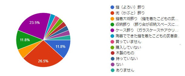 五月人形の種類では「兜飾り」を購入した人が最も多く、続いて「ケース飾り」「収納飾り」が購入されています。ママたちは、飾る場所や収納スペースを検討して、コンパクトな五月人形を選んでいるようです。