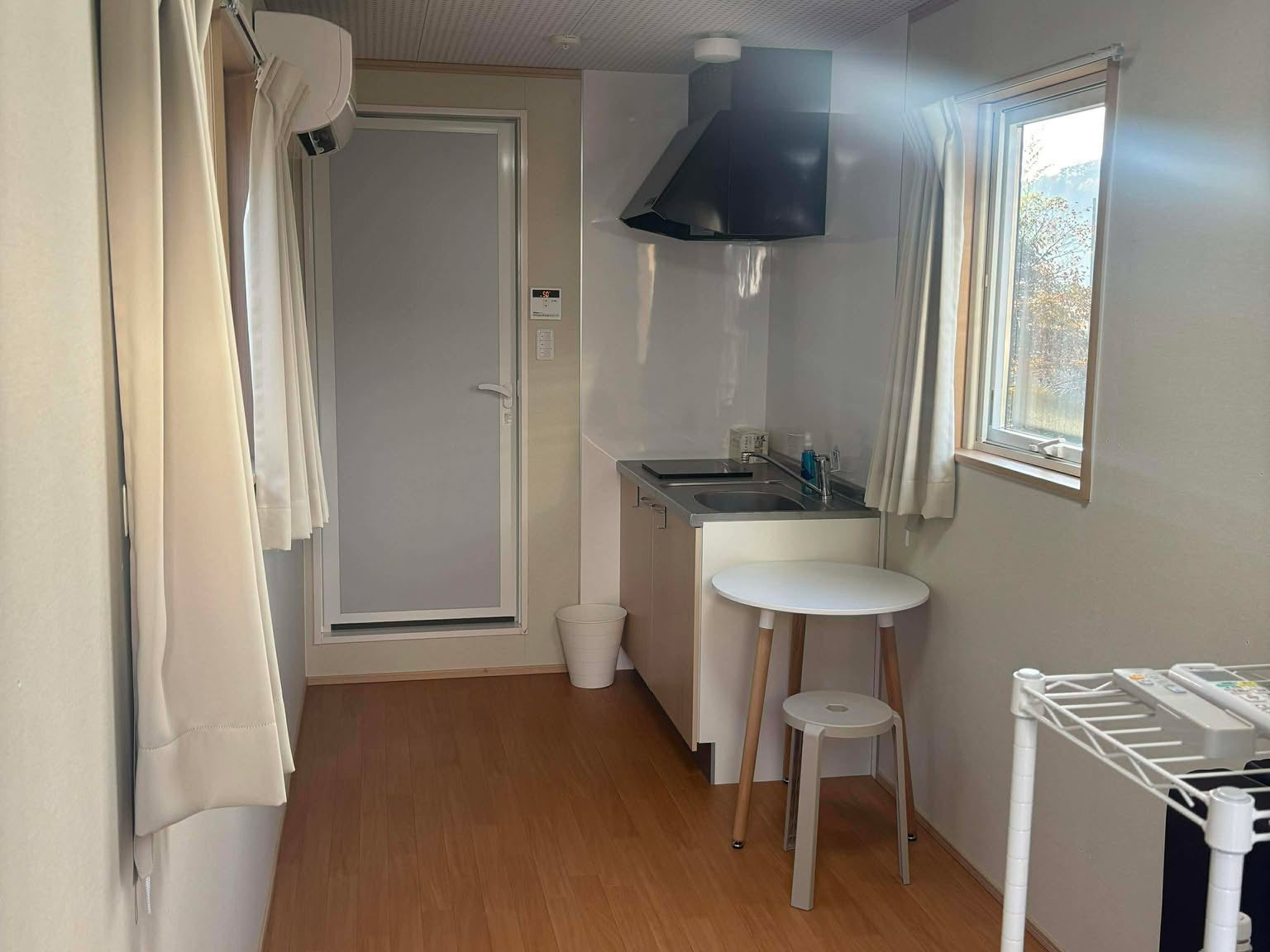 簡易キッチン、共同スペースを備え、ボランティア活動に適した最低限の設備を整備。
