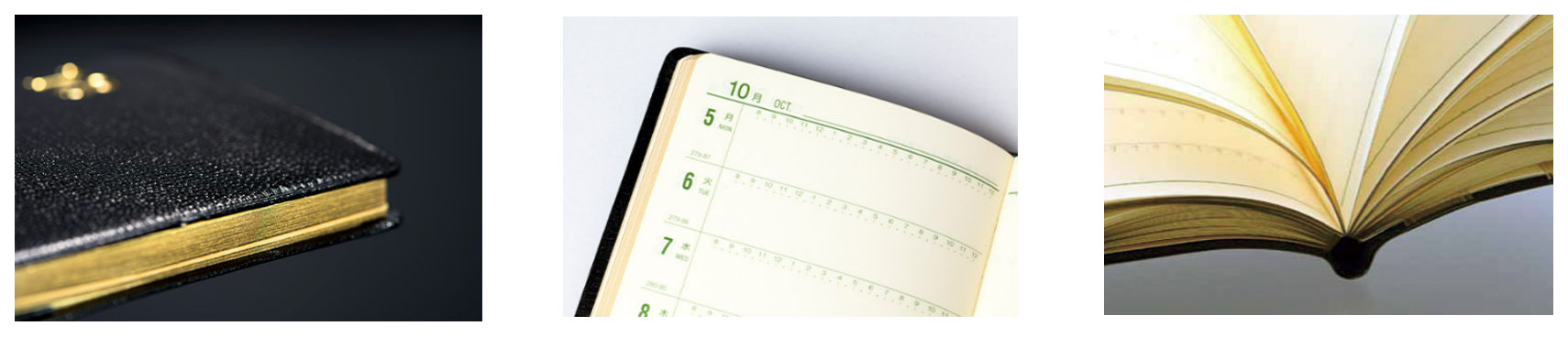 能率手帳のアイデンティティである時間目盛り付きのスケジュール欄の下に、方眼(3.5mm)の記入スペースを確保したデイリータイプ。日々の日記をたっぷり書き込んだり、チケットやシールを貼ったりしてコラージュを楽しむのもおすすめ。日付が印刷されていないので、気が向いた日からいつでも始められます。表紙は能率手帳ゴールドと同じ革(ヤンピー)を使用し、小口(手帳の断面)には本金が施されています。