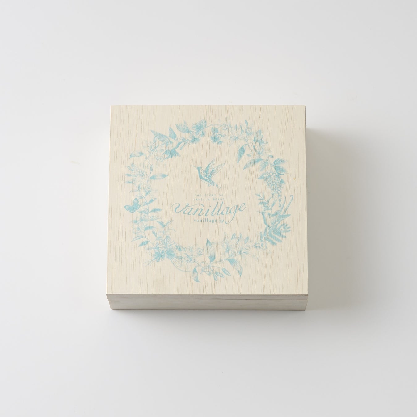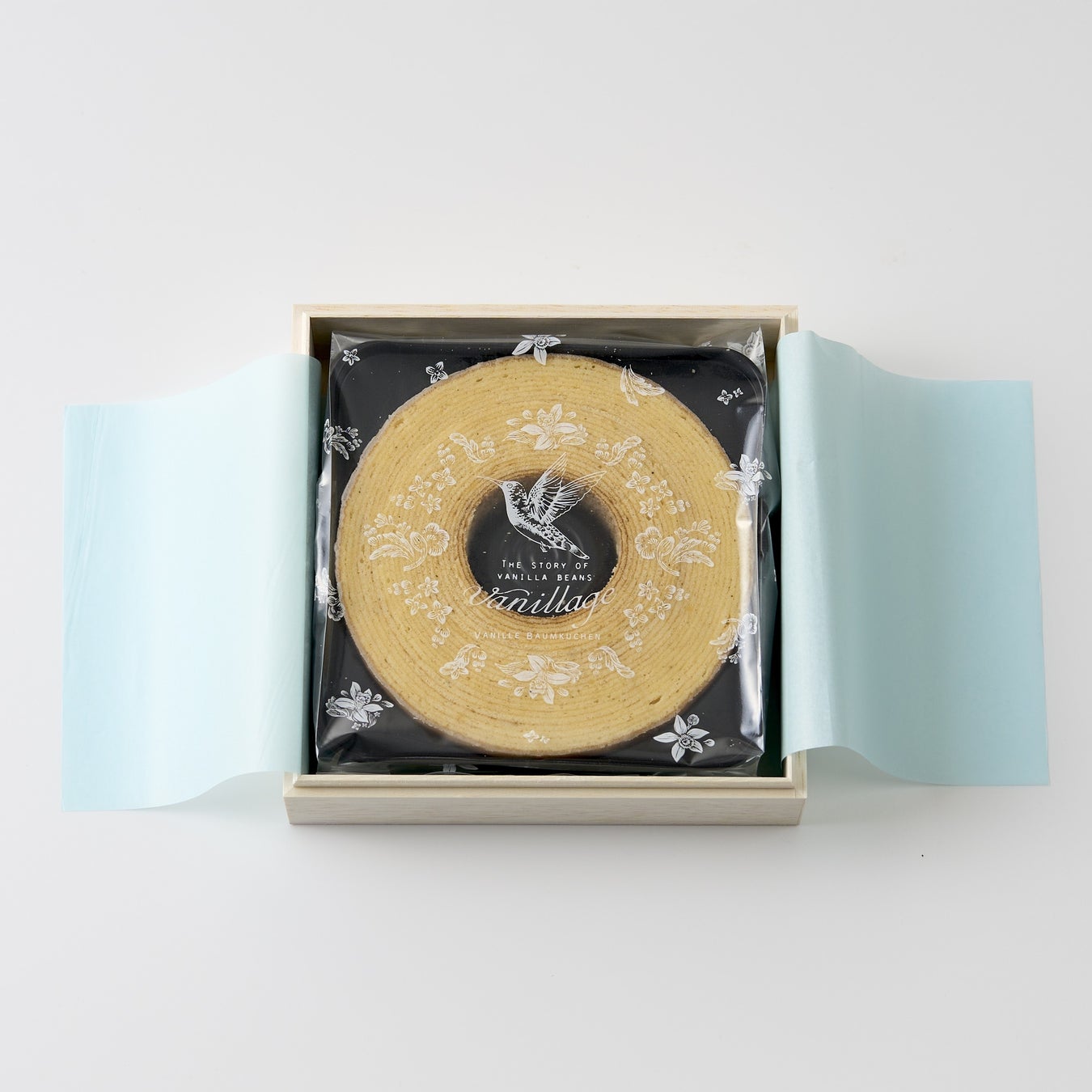 バニラバウムクーヘンはバニラージュのブルーのロゴが目を引く木箱に入っています。自分へのご褒美やお世話になった方への感謝の気持ちを伝えるのに最適です。