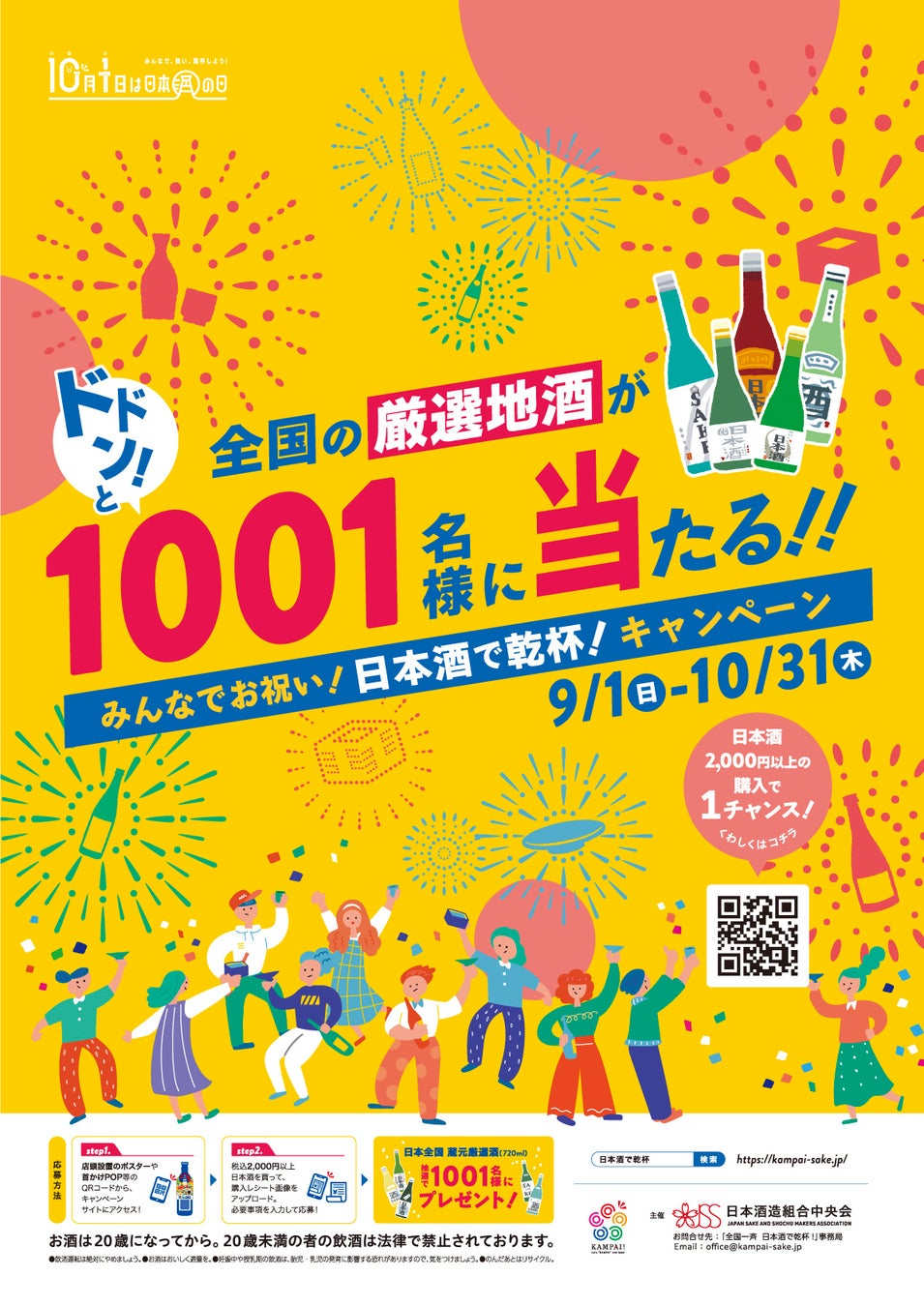 ・内容:応募期間中2,000円(税込)以上の日本酒を購入したレシートを撮影し、応募フォームにアップロードして応募すると、抽選で10月1日の「日本酒の日」に因んだ1,001名様に「日本全国の厳選地酒(720ml)」をプレゼント。