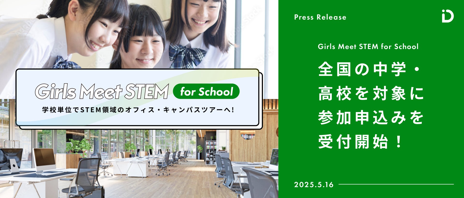 公益財団法人山田進太郎D&I財団は、中高生女子を対象としたSTEM(理系)体験プログラム「Girls Meet STEM」において、学校単位で参加できる「Girls Meet STEM for School」を始動し、全国の中学校・高等学校からの参加申込の受付を開始します。本プログラムは学校の希望に応じて財団が参画企業や大学等と調整し、STEM体験やSTEM領域の現場で活躍する女性との交流の機会を提供する仕組みです。第一弾は5月15日に東洋英和女学院中学部で実施し、今年度は10校以上での開催を予定しています。
