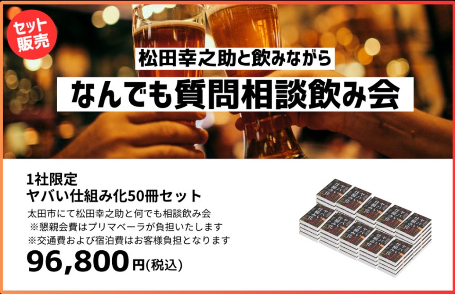 北関東を中心にリユース事業など、4事業部53店舗でグループ年商約51億円の株式会社プリマベーラ(群馬県太田市/代表 新井英雄)の松田幸之助(経営サポート事業部社長執行役兼CCO)は、株式会社あさ出版(東京都豊島区/代表 田賀井弘毅)より発行した、松田幸之助 著「ヤバい仕組み化」の発売1周年記念キャンペーン商品を期間限定で11月20日より12月25日まで発売いたします。