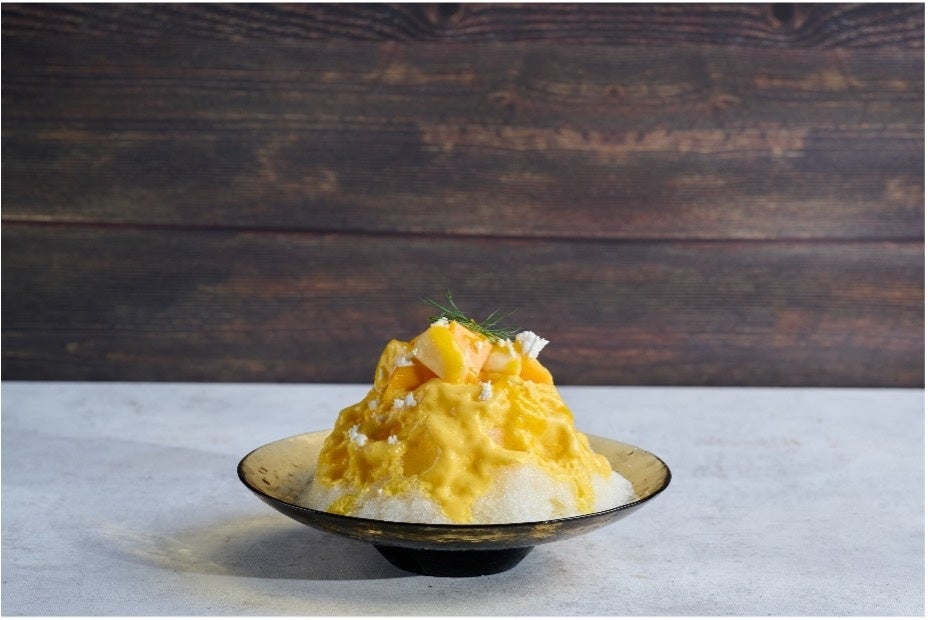ZEN HOUSEで定番の人気かき氷「桃」に、今年はマンゴーを掛け合わせた大人のミックスジュースを思わせるかき氷に仕上がりました。桃とマンゴーを使用したヨーグルトテイストのフルーツジュース“フルーニュ”をベースに、果肉をトッピングした贅沢な一皿。上には山羊ミルクを使用した塩味のあるフェタチーズを散らして、サラダのような爽やかな感覚に仕上げました。ディルの香りとともに、大人のかき氷をお愉しみいただけます。