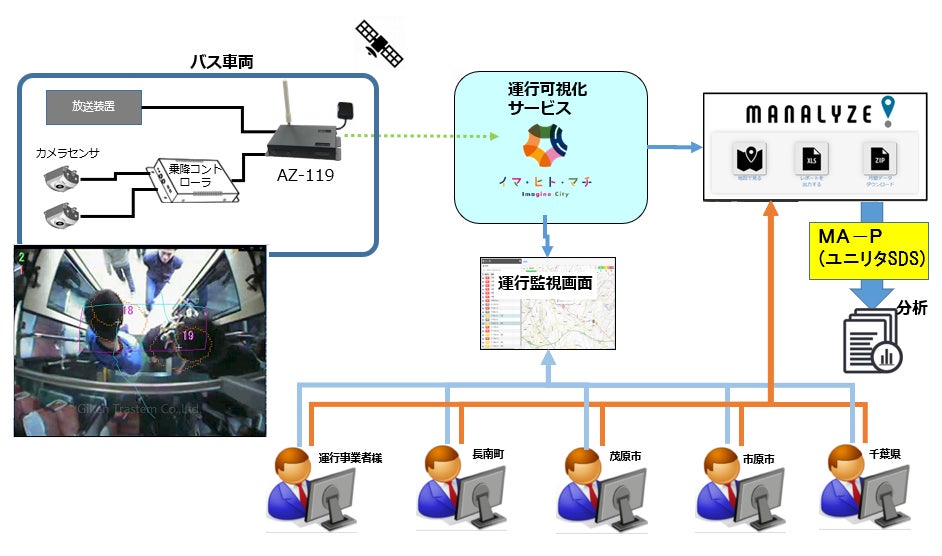 バス車内に車載器と乗降カメラセンサーを設置。音声合成装置と連携し、運転手や運行管理者の手間を一切かけずバスの遅延データおよび各バス停での乗降数をカウント。さらにそれ等のデータを可視化、ダウンロードできるMANALYZEを利用しデータ分析し、課題抽出を行う。