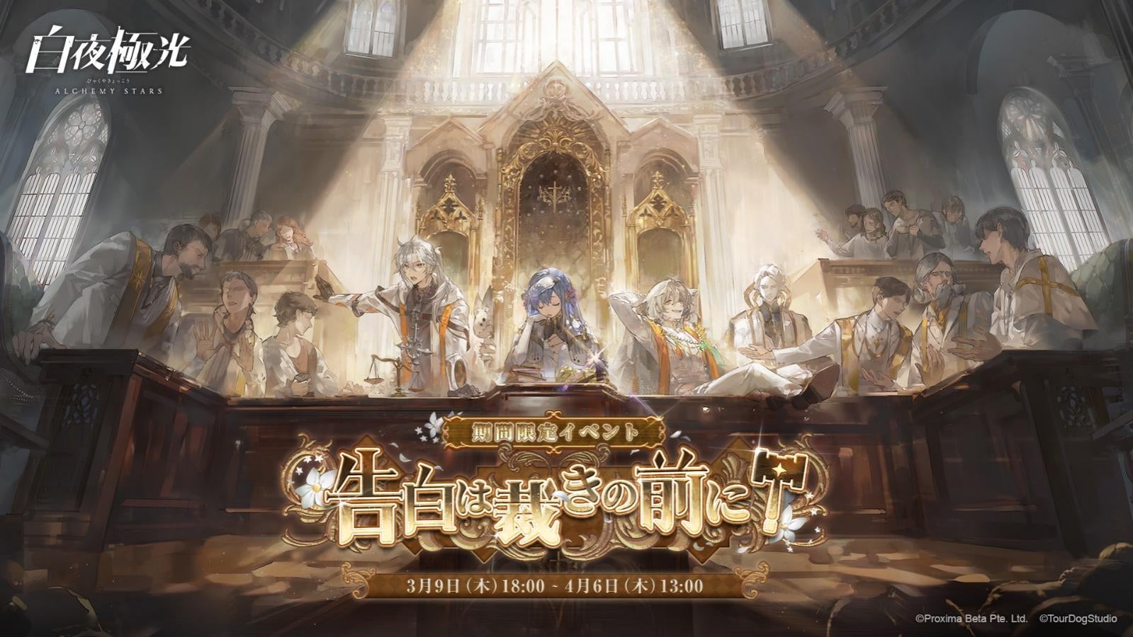 『白夜極光(びゃくやきょっこう)』では3月9日(木)より期間限定イベント【告白は裁きの前に】が開催されます。今回のイベントにはステージ【告白の日】、高難度ステージ【花枯れて後】、イベント商店【証拠品検証】、テキストアドベンチャー【恋愛裁判】、光霊お試しステージ、期間限定ログインボーナスなど、盛りだくさんのコンテンツが含まれています。
