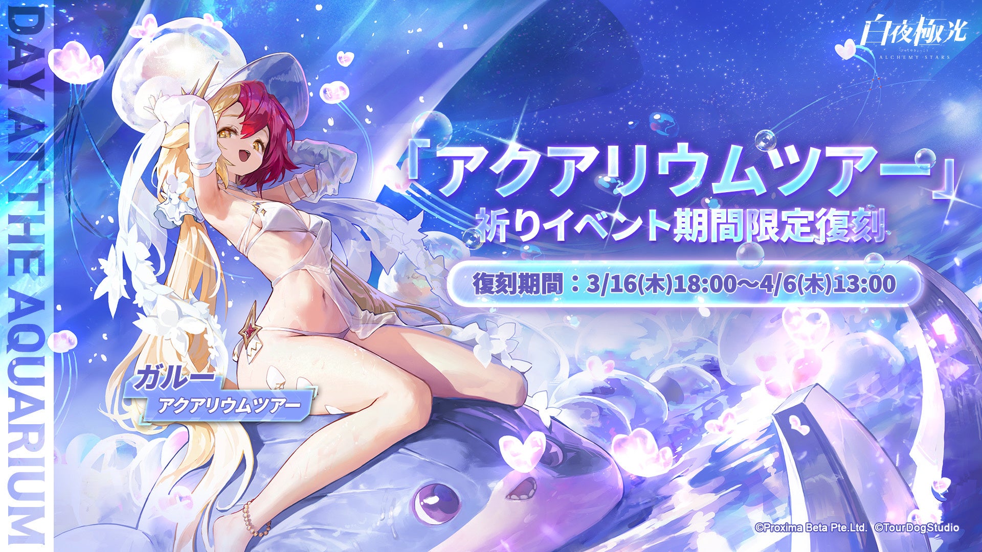 ガルーのプレミアムコーデ【アクアリウムツアー】が期間限定で復刻します。このコーデにはプレミアムコーデ限定の立ち絵、会話アクション、ボイス、戦闘エフェクトが付いています。期間限定復刻の【アクアリウムツアー】祈りイベントで獲得できるチャンスがあります。ぜひご参加ください。