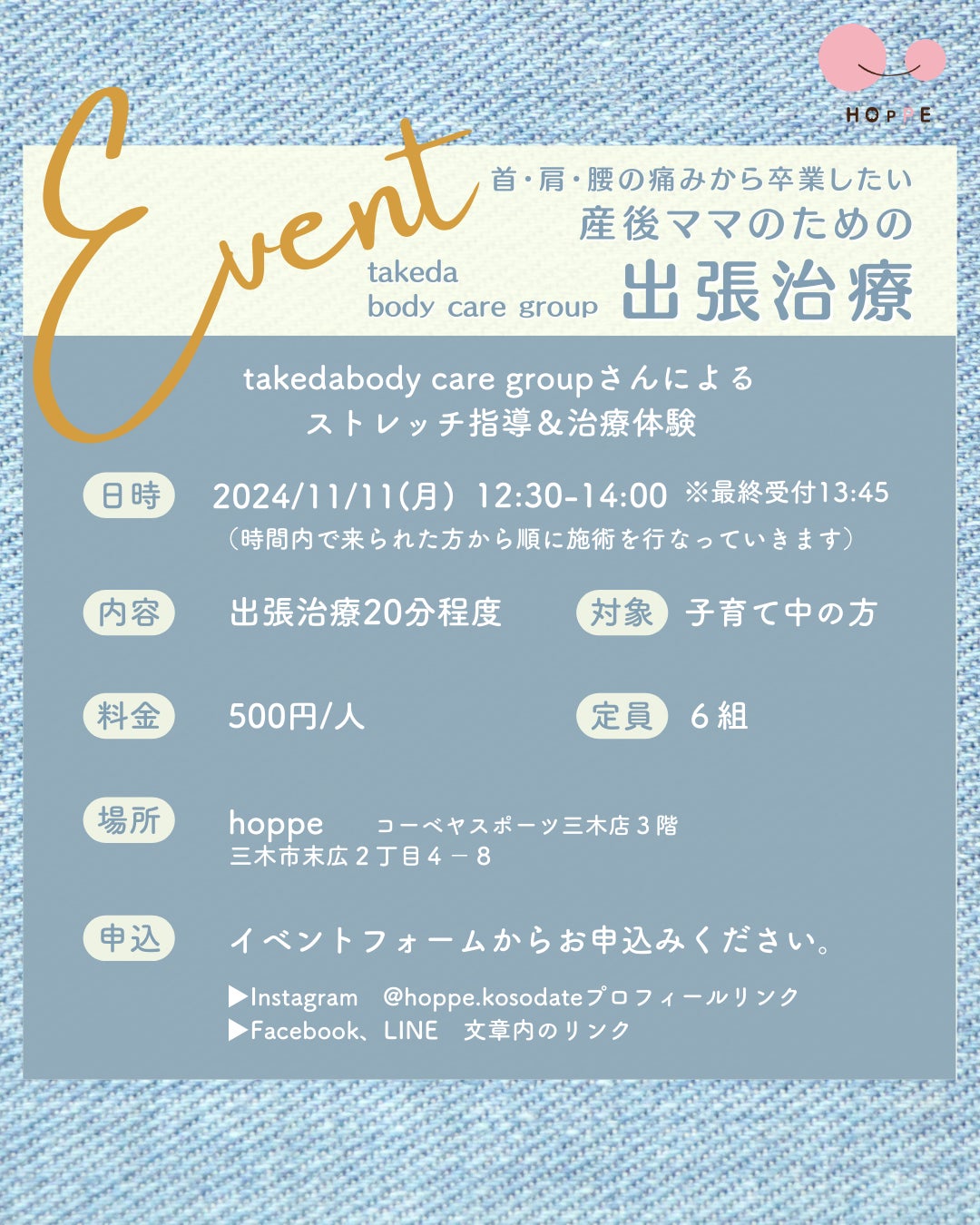 特定非営利活動法人ほっぺ(代表:大森奈津子・兵庫県三木市)は、takedabody care groupさんをお招きし、2024年11月11日(月)hoppe(コーベヤスポーツ三木店3階)にて、『産後ママのための出張治療』を開催いたします。