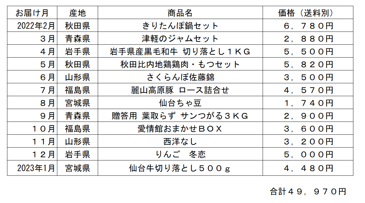 2月発送の秋田県の特産品「きりたんぽ鍋セット」からスタートし、青森の「サンつがる(りんご)」や山形の「佐藤錦(さくらんぼ)」、宮城の「仙台ちゃ豆」、福島の「野菜ボックス」、岩手の「冬恋(りんご)」など一年中東北6県の特産品をご自宅で楽しめるコースです。