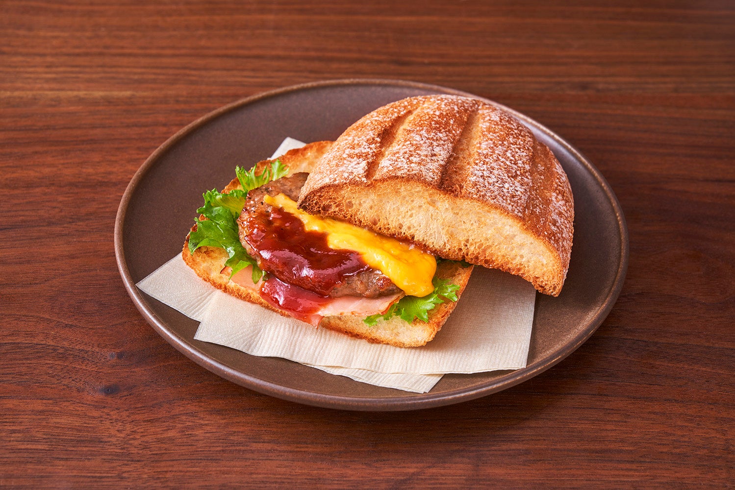 ハムとチーズの絶対的に美味しい組み合わせの商品。チェダーチーズのやさしい塩味と柔らかいハムが魅力的で、フリルレタスや玉ねぎの食感もアクセントとなります。