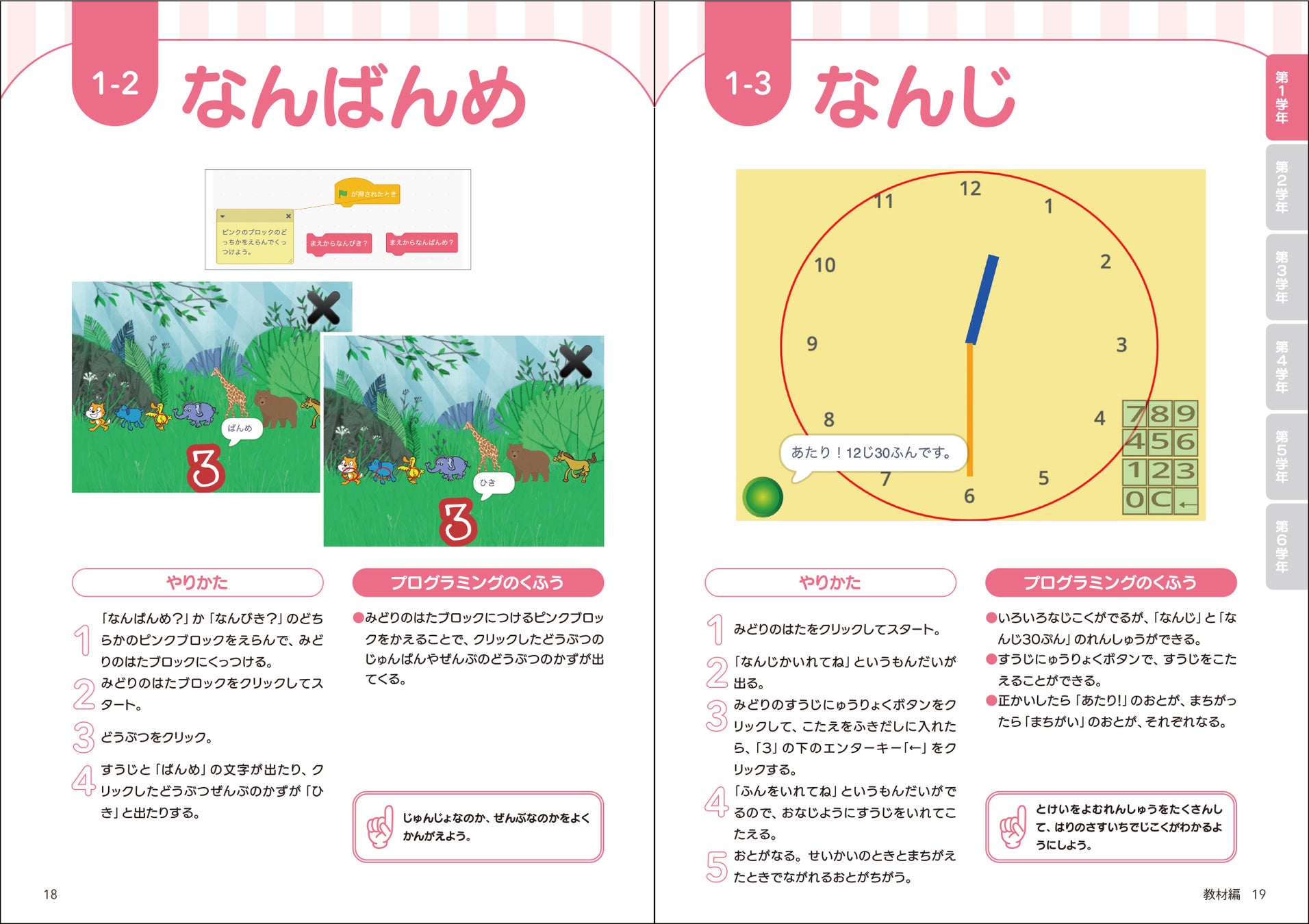 →操作方法や仕組み、各単元で理解したいポイントがわかりやすく書かれた子どものため「教材編」、プログラムの組み立て方、各単元の教え方が詳しく解説された教員・保護者のための「指導編」で構成されています。