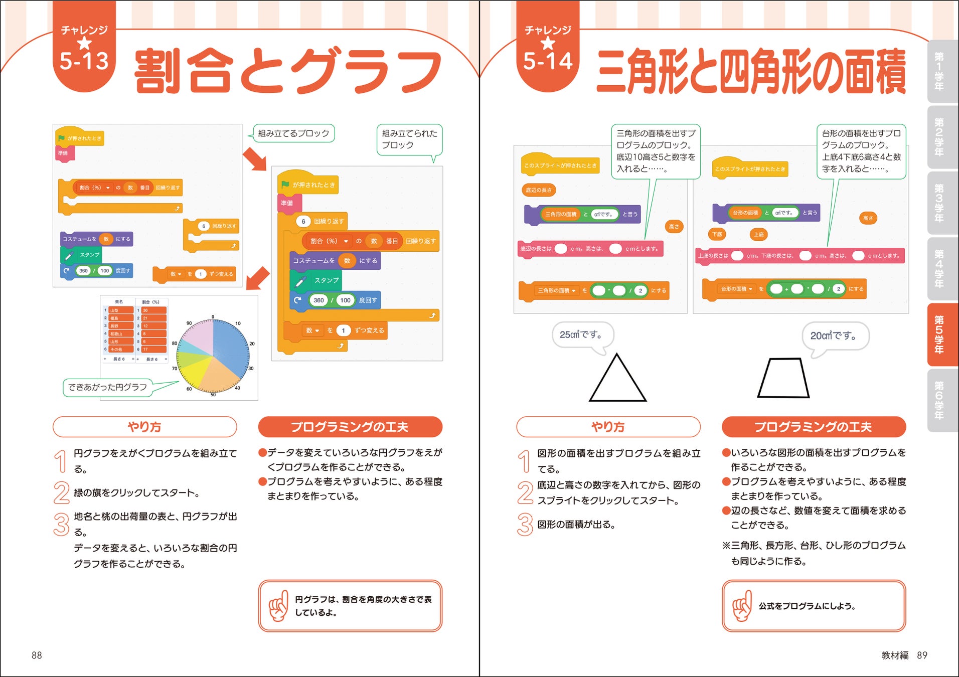 ⑤4年生からは、プログラムを自分で組み立てる単元も収録!