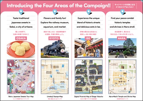このキャンペーンは関西への旅行者に、メジャーな観光地だけではなく関西全域の多様な魅力を楽しんでもらうことを目的として、下記4エリアでスタンプラリーを実施します。各エリアが独自に作成した、地域の魅力が詰まったイラストデジタルマップとスタンプラリーを組み合わせることで、旅行者に関西のローカルな魅力を体験してもらうことを目指します。
