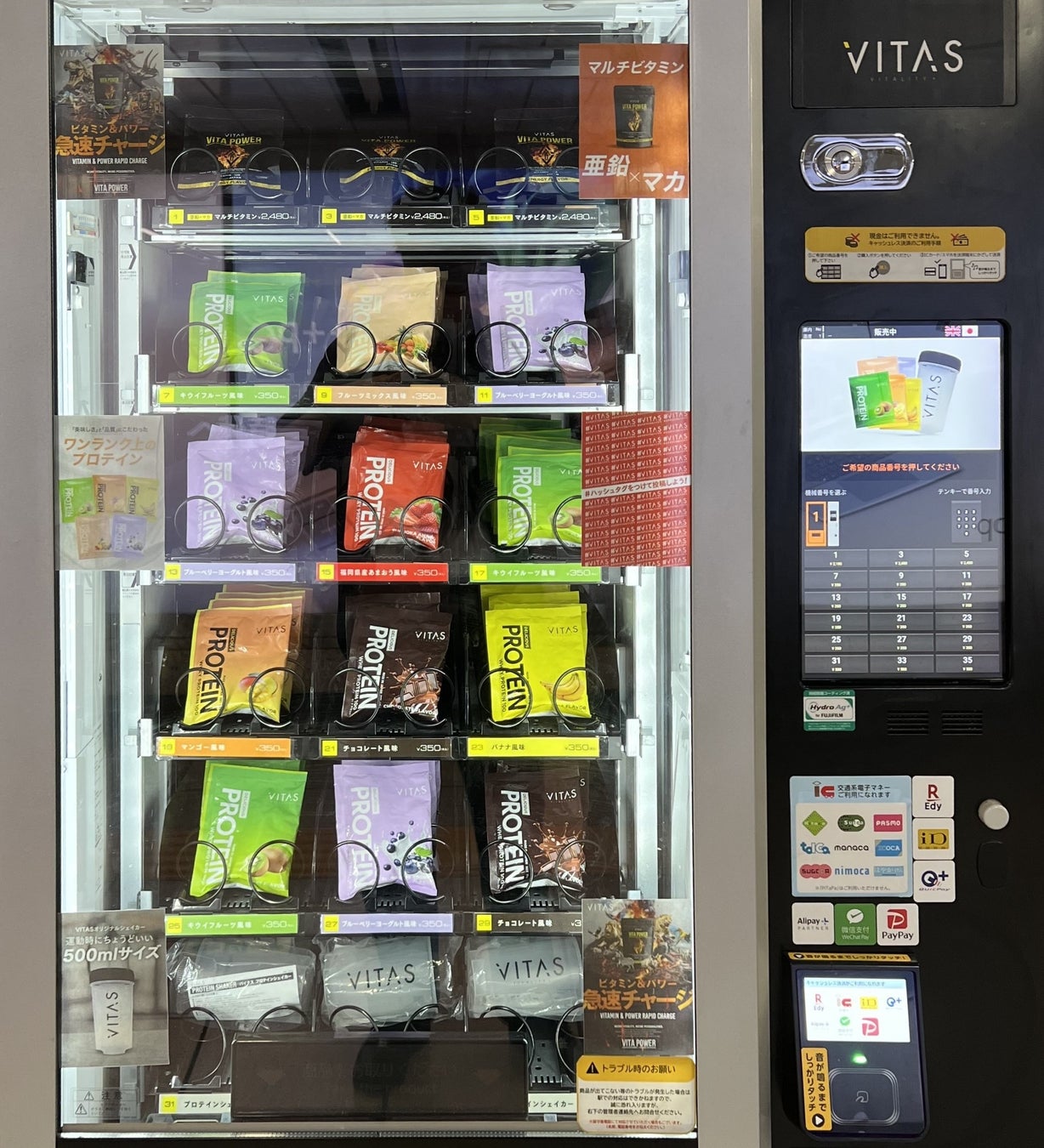 今回、大手町駅に初登場したVITASプロテインの自販機。9月2日~9月30日の期間、地下2階の B0出入り口付近に1台設置されます。自販機で購入できるのは次の3商品。